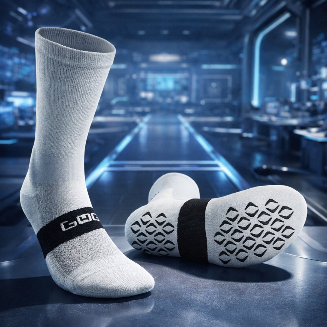 Strategically placed outside grip elements maximize traction between sock and shoe.